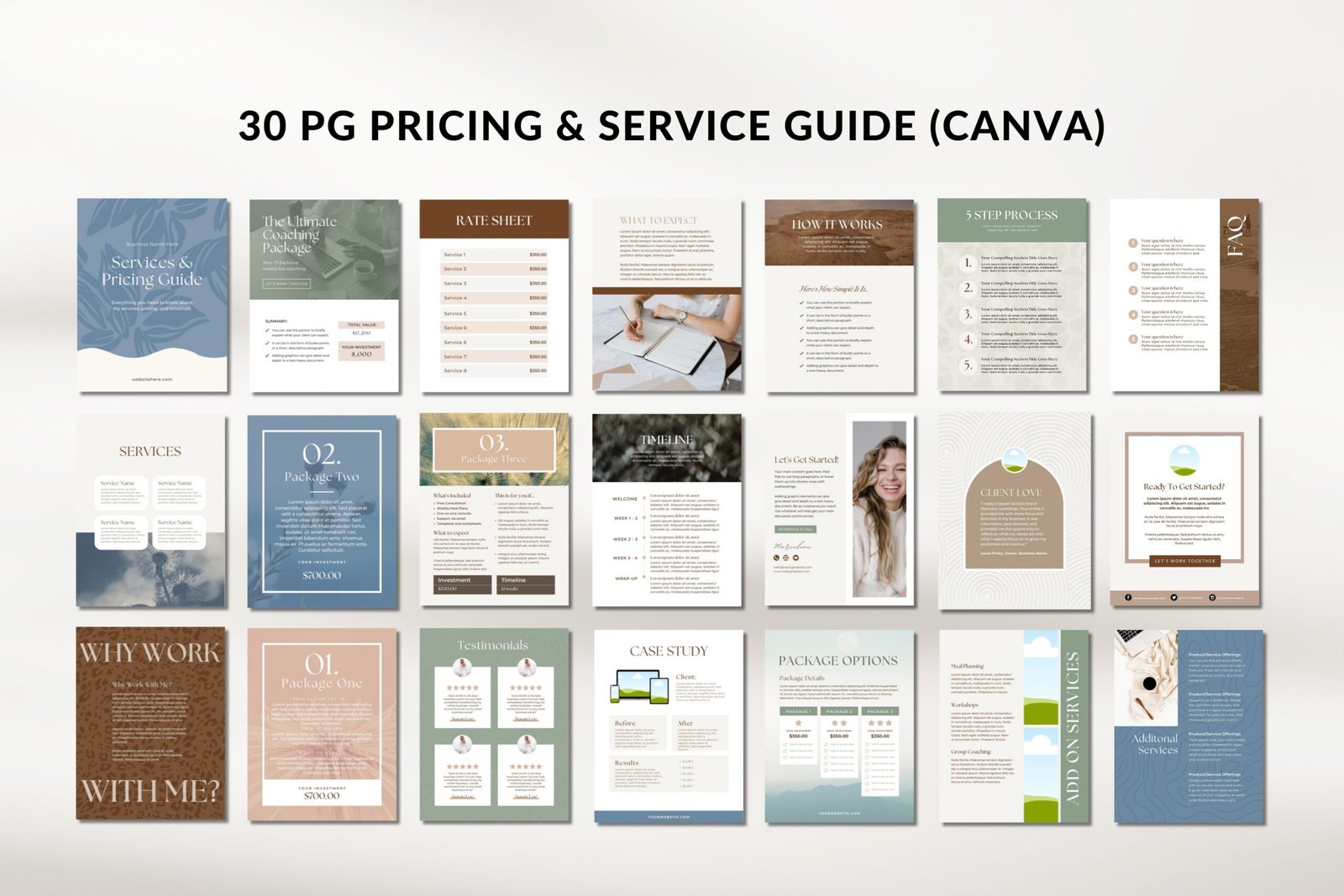 It’s time to WOW potential clients with this Service & Pricing Guide Template. No more frantically trying to pull together pricing and offers for new clients. This template provides you with everything you need to show off your unique brand, services, and offers to prospective clients.