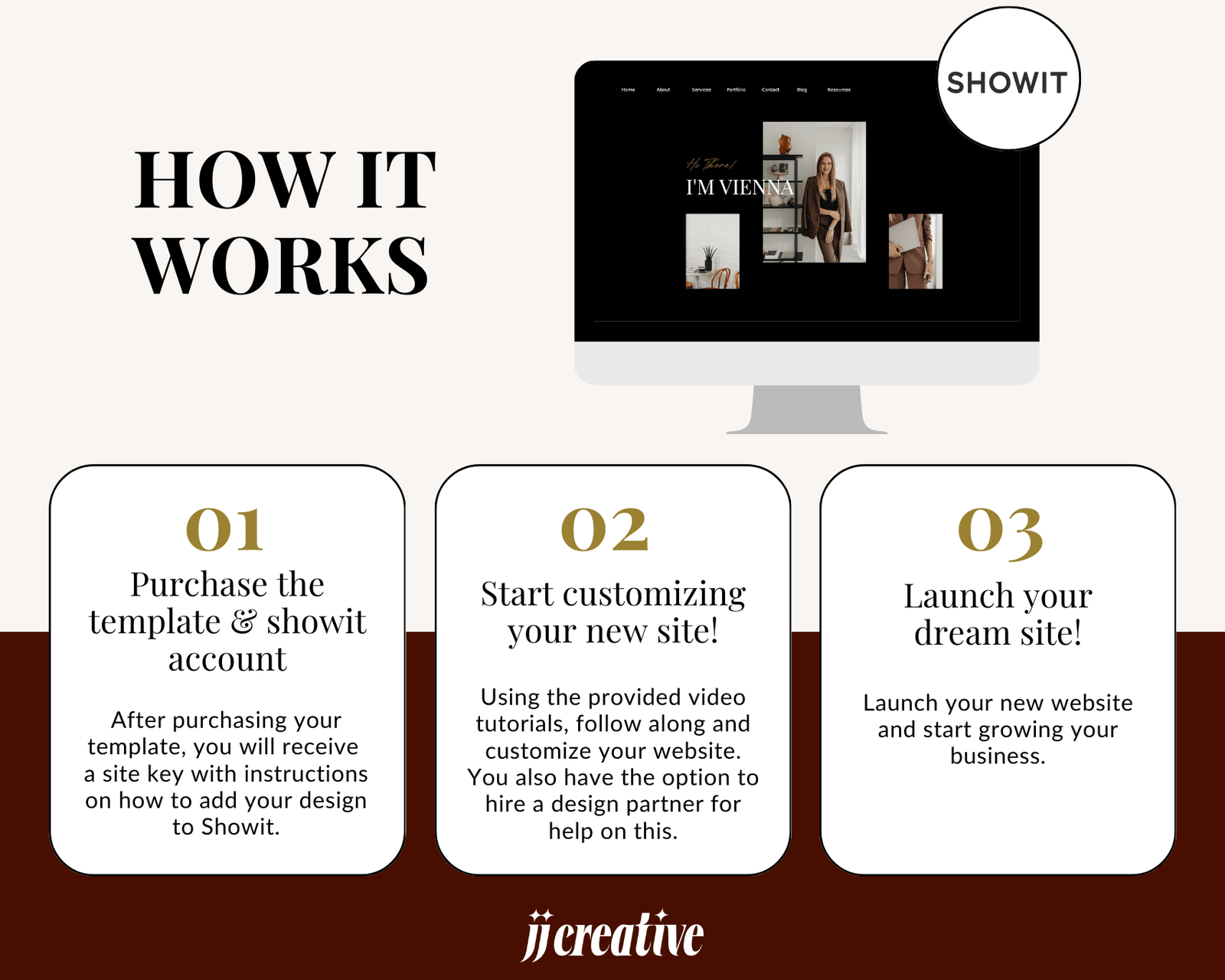 Once you purchase, you’ll receive a PDF with a video tutorial and a unique code to easily upload the template to your Showit account.